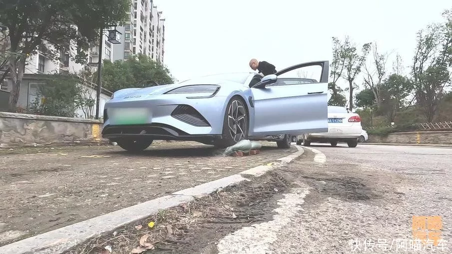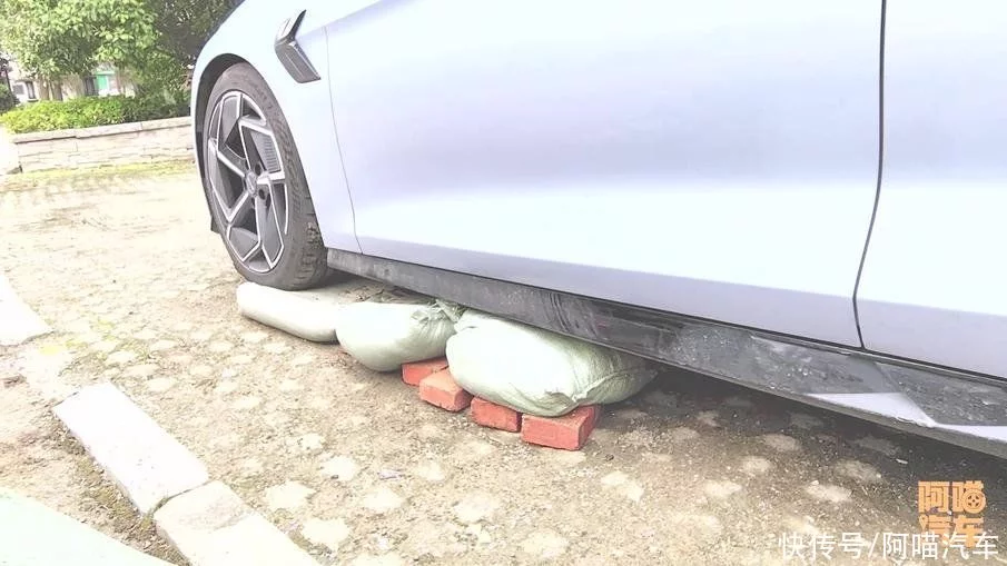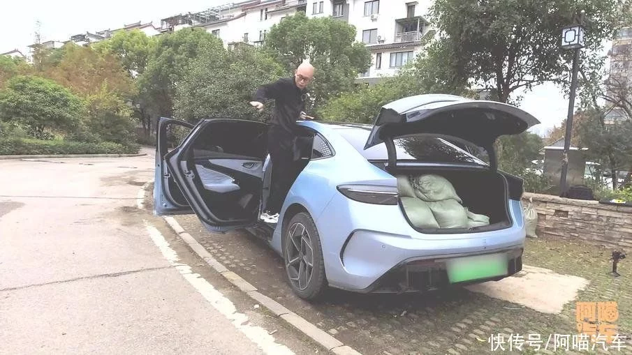现在我把海豹开上台子,大家看到我把车子的4门和尾门打开,然后喵哥在海豹的两个没有着地的脚上给它施加重量。