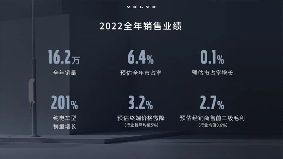 从沃尔沃2022年的销量来看,纯电车型销量同比增长201%是这一年沃尔沃为数不多的亮眼成绩,但这一组数字人前展示的越光辉,越能说明沃尔沃电动化背后的苍凉。