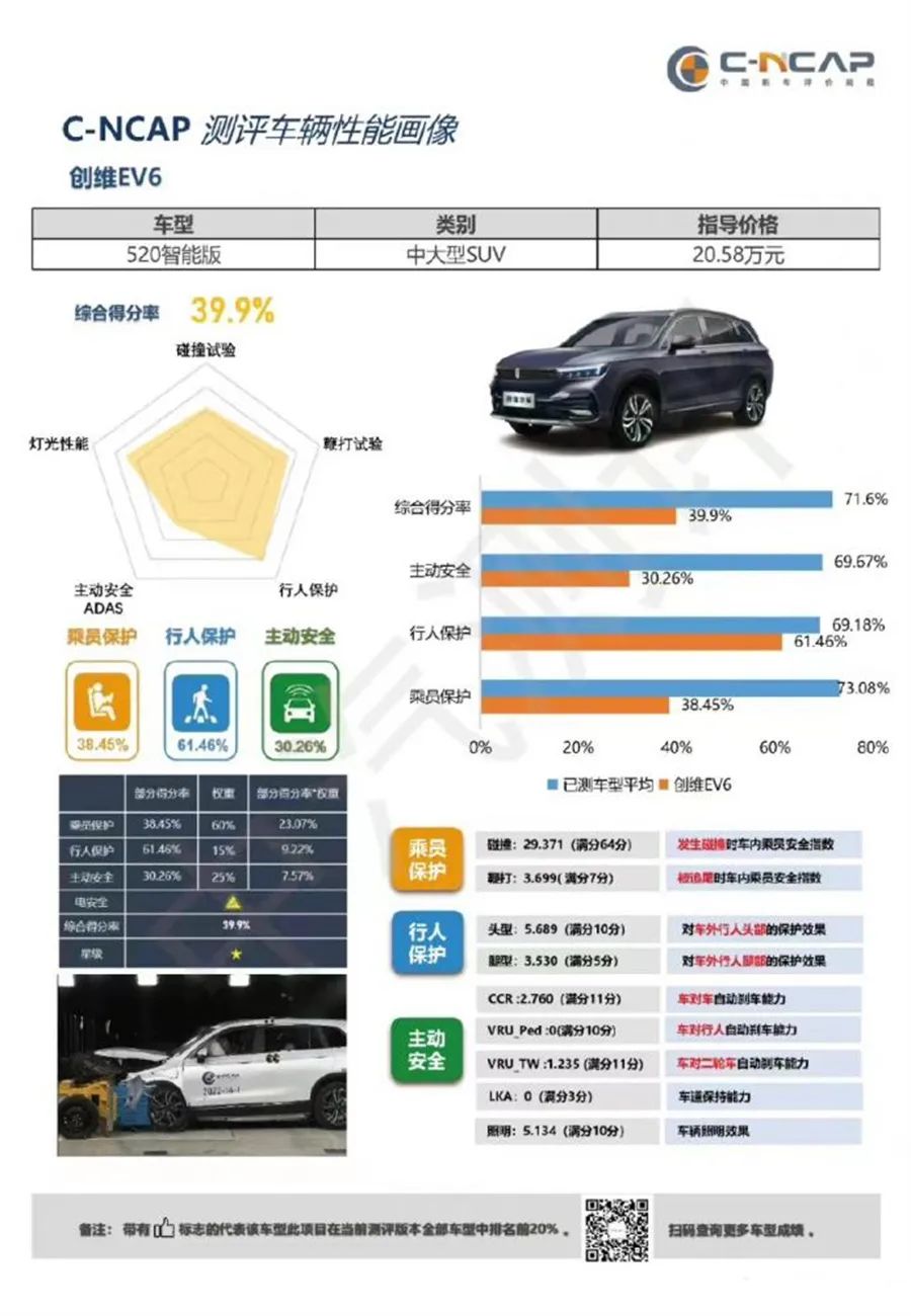 【文/道哥说车 浅浅】C-NCAP在汽车界被戏称为“五星批发部”,因为但凡参加该机构碰撞测试的车型,都会得到五星碰撞测试成绩。然而最近C-NCAP公布的创维EV6碰撞测试成绩却成为史无前例的存在,该车的综合得分率仅为39.9%,评测成绩仅有一星,成功刷新了近年来C-NCAP车型碰撞测试成绩的下限。
