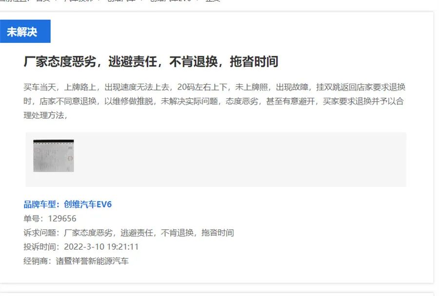 此外,《财圈社》旗下道哥说车编辑还注意到,虽然创维汽车的名气不大保有量也不多,但是网上却也出现了相关投诉案例。“买车当天,上牌路上,速度无法上去,20码左右上下,未上牌照便出现故障。”一位创维EV6的车主在汽车消费网上投诉称自己新买的车就出现了毛病。目前,该问题投诉依然显示未解决的状态。