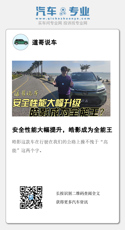 那在行驶到公路阶段,这个皓影带给我们的感受体验是更加独特的.主要从两个方面来说吧。低它的动力啊。这个是1。5t的这个车型,所以说它的整个动力。对于这份城市道路来说是足够的适用而且在整个辅助驾驶的智能化程度。皓影这辆车也做的非常好,那其实我们可以感知到就是整个全新皓影,他带给我们在智能安全防护上面是下足了功夫,无论是从他在弯道的变道辅助上面,还是在车辆行驶的时候。对于前方的感知,他全新配备了更加先进的安全雷达,以及探头去保障驾驶员和乘客安全,其次呢,我们再说一下这个抬头显示,其实我们开过很多车,他都配了HUD这个抬头显示,那皓影这款车给我们。还有显示的显示的是更加的清晰明了而且简单。其实最主要的呢是信息的准确。只要提供准确的信息以及准确的显示,才会让我们的驾驶更加的安全。皓影这款车在行驶在我们的公路上操不愧于“高能”这两个字啊,这样车也展示出来了足够出色的动力组成和性能啊,这是让我们和我们的受众足够满意的一个表现,动手关注,道哥说车。