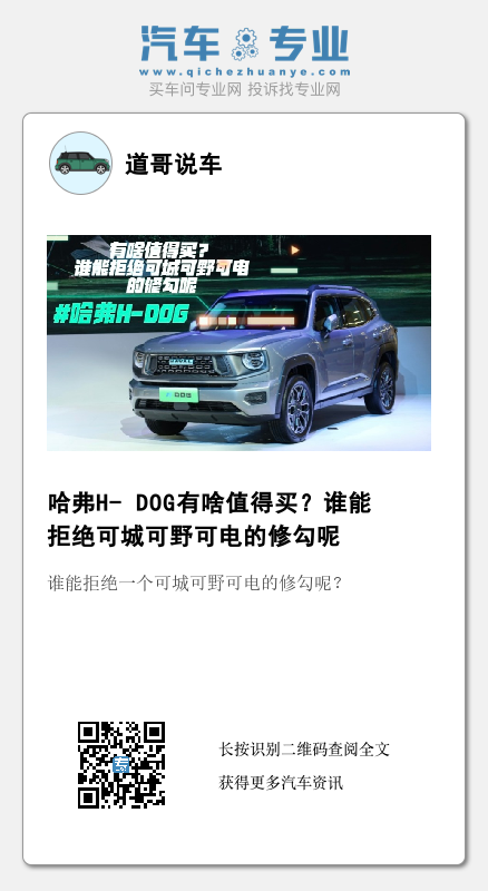 继大狗和酷狗之后,哈弗汪汪队又添新成员!今天就聊聊哈弗H-DOG。哈弗H-DOG搭载混动专用的1.5T涡轮增压发动机+2挡DHT总成,以最合适的驱动方式应对不同路况,总功率240kW、总扭矩530N·m,性能足以媲美合资2.5T中大型SUV。综合续航更是超过1000公里。在充电效率上,电量从30%充电至80%仅需22分钟。谁能拒绝一个可城可野可电的修勾呢?