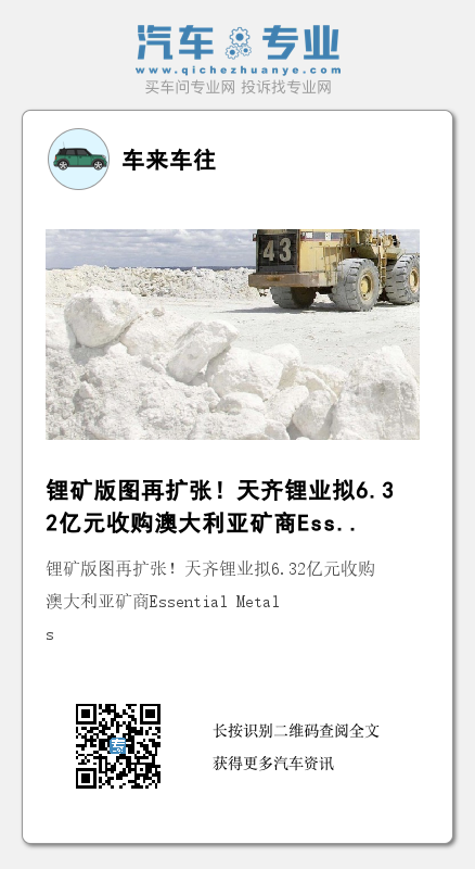 据外媒报道,天齐锂业已同意收购澳大利亚锂资源勘探公司Essential Metals Ltd.,这项交易可以加速生产足够供应约1,000万辆电动汽车的锂。