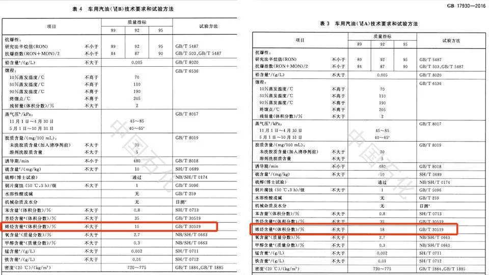 从国三开始,烯烃在汽油中的占比是35%,到国六A的18%。再到国六B的15%,这是一直在削减的。