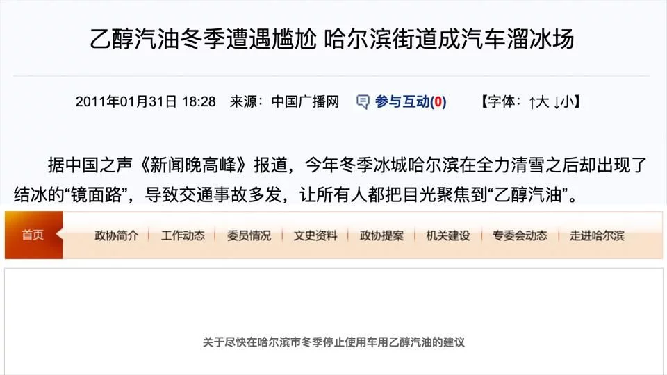 文章里提到的大致问题,是乙醇汽油不耐用、冬天排气管滴水到路面易结冰。