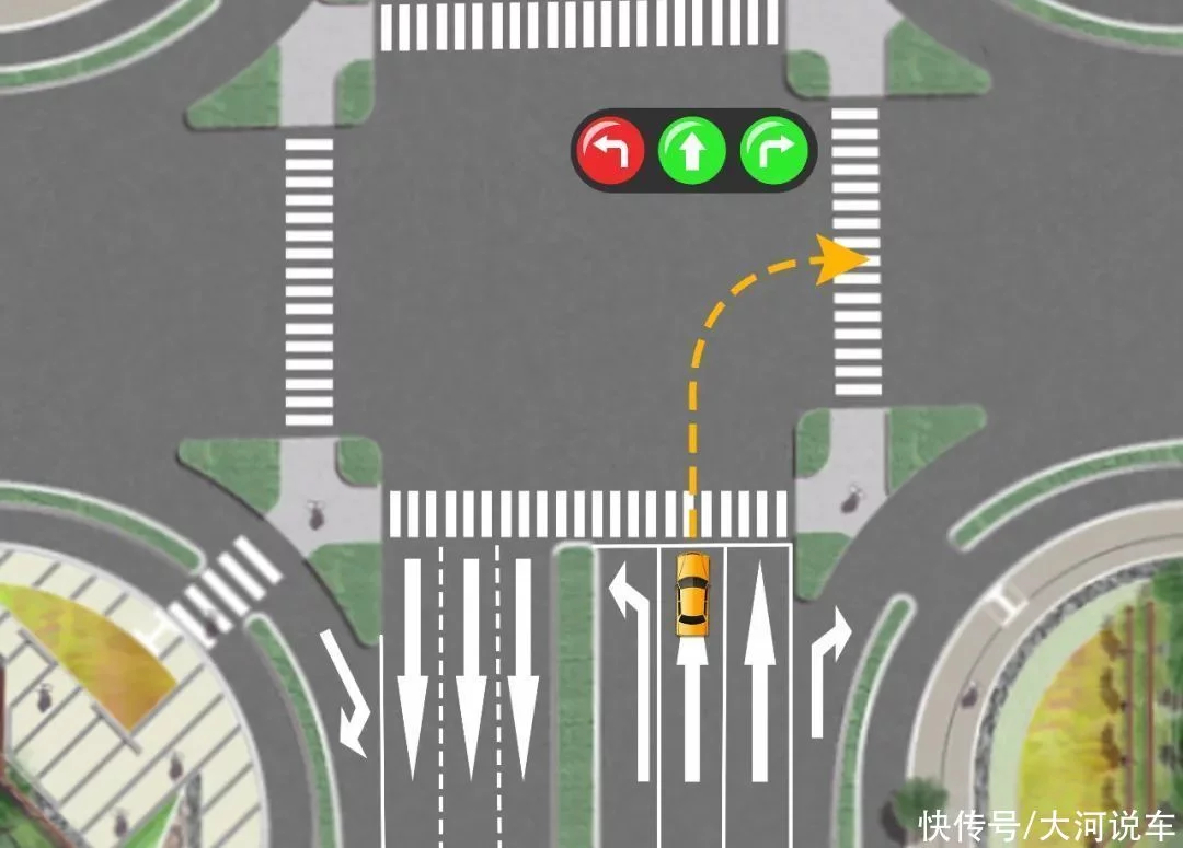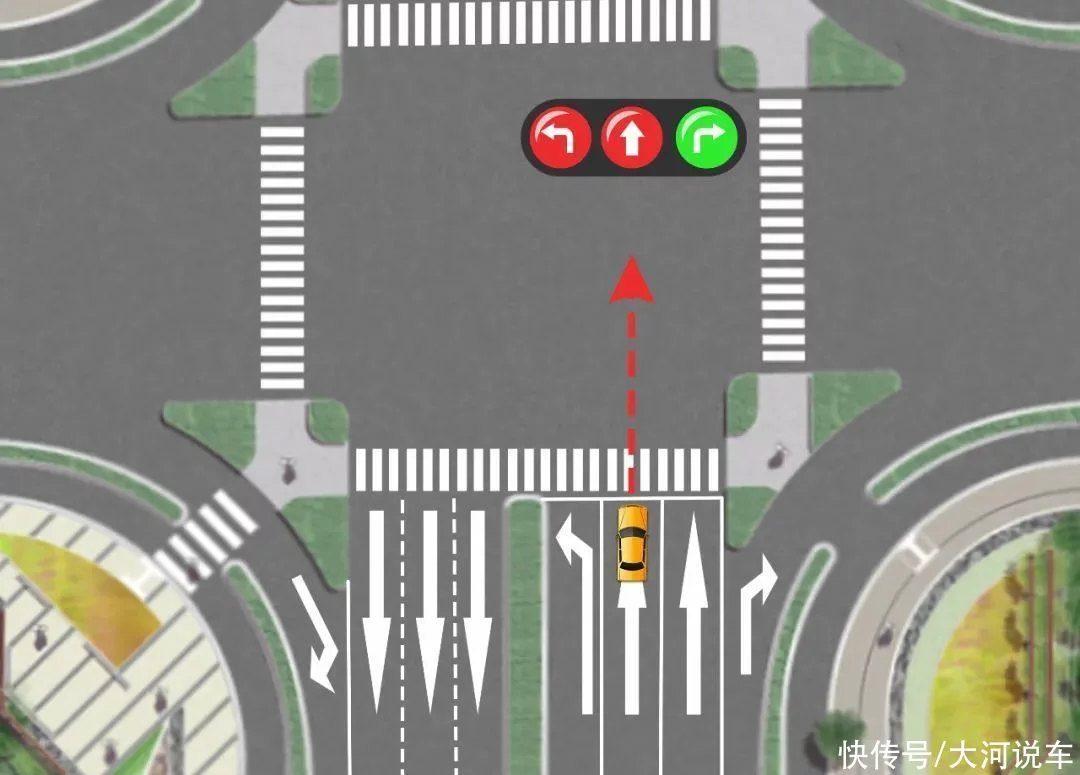 并且按照行进方向的交通信号灯通行