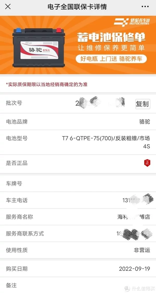 接下来是安装过程,派单到本地的一家授权经销商上门安装的,没有任何附加费用,一切很顺利。跟安装小哥聊天得知,他们是本地的一级代理商,也仅代理了骆驼这一个品牌。扫码查验是正品,同时激活了官网24个月电子质保卡。装上后第一次行驶直接触发启停功能,总的来说很完美的一次购物体验,值得推荐!