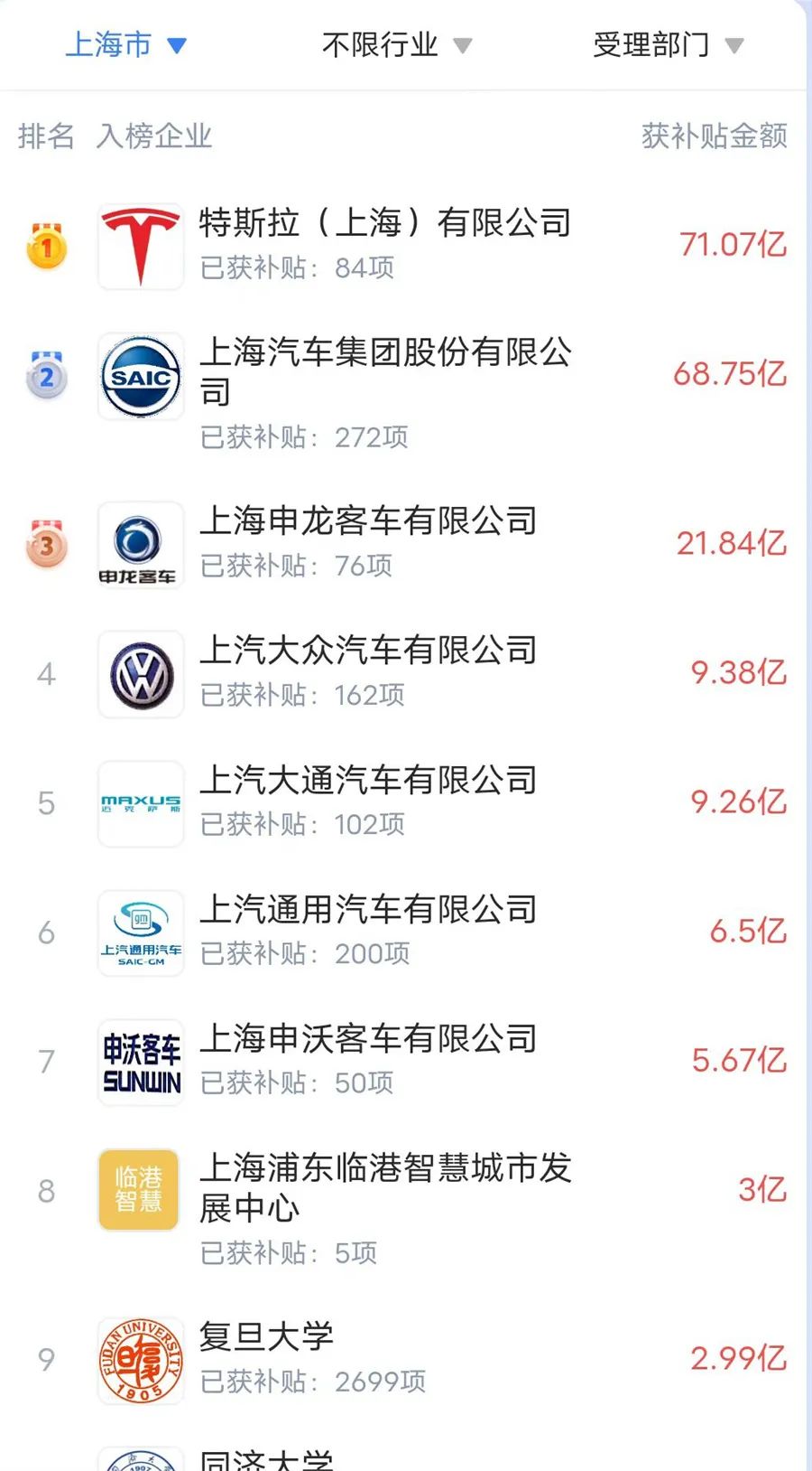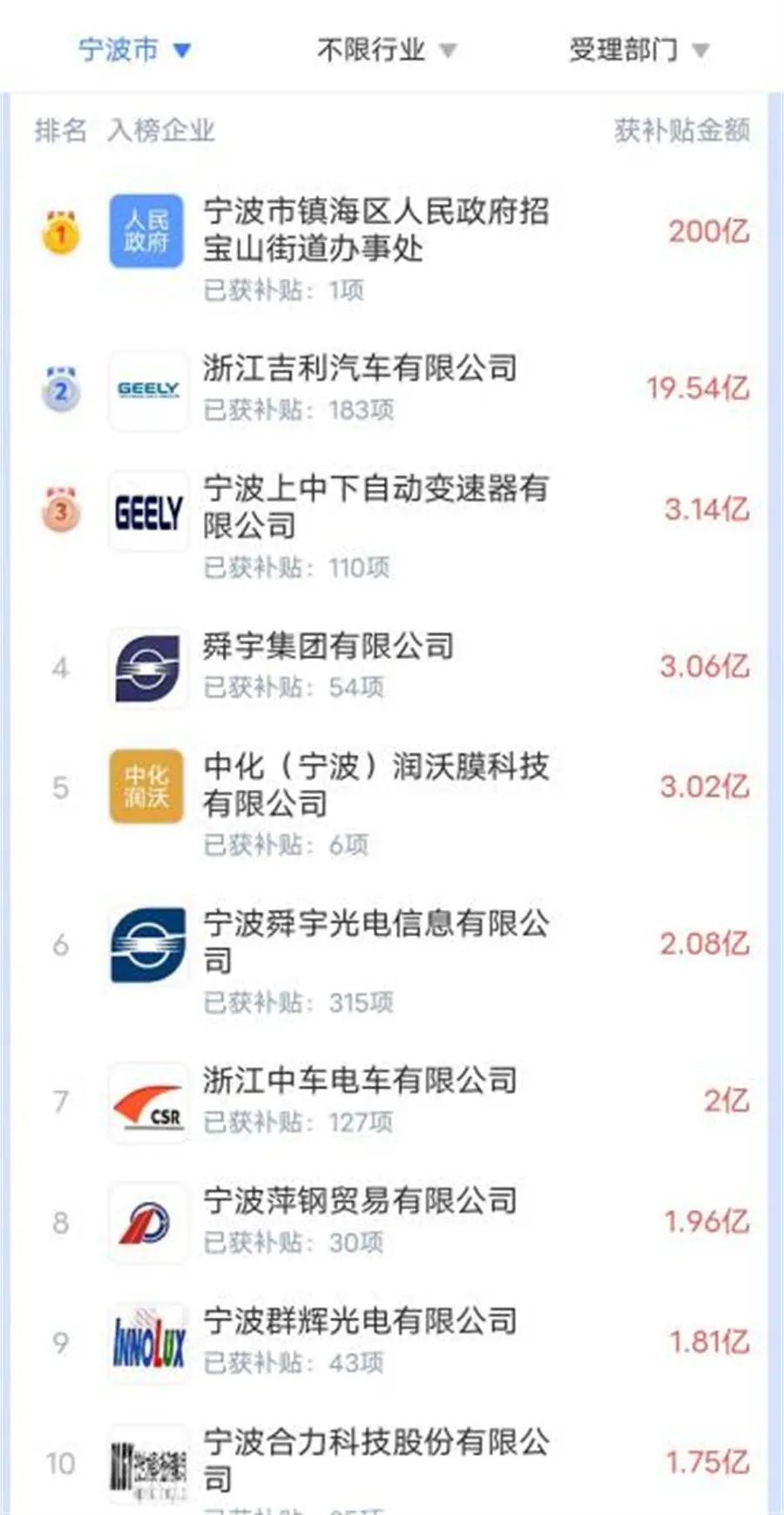 日前,《道哥说车》编辑在企知道APP上搜索各地企业补贴排行榜,再次发现,无论是像北上广深这样的一线城市,还是像重庆、合肥这样的新一线城市,亦或是像芜湖、保定这样的三线城市,政府补贴榜首的均为当地的车企。