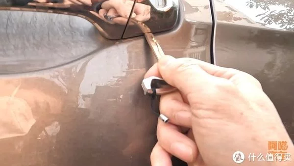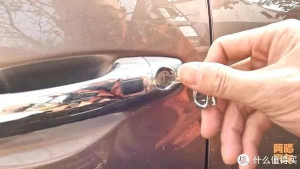 然后拿着这个钥匙,过来找到门把手,有些车子,这个地方,现在这个锁孔是堵住的。
