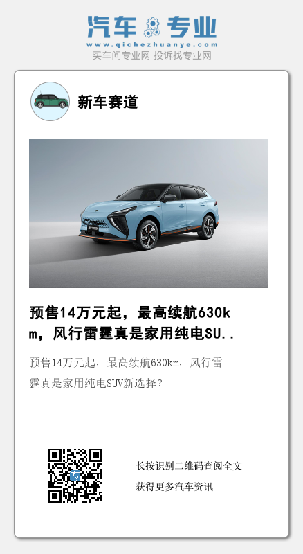 从风行雷霆的续航表现来看,其实算是很不错了,入门款确实不太行,但是选择除入门版之外的版本,我个人预测630km的低配版本,价格会在16万元左右,这个价格就能买一台超600km的纯电续航里程,确实是很不错了。再看同价位的其他对手,其实大多数也只能达到500km的纯电续航里程,所以尽管东风风行在纯电领域的造诣不深,该车凭借不错的账面参数,也能达到同级别领先水平。