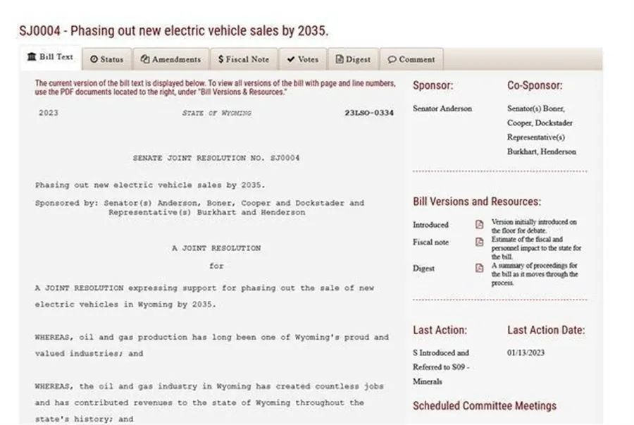 近日,美国怀俄明州提出了一项全新的提案,他们计划到2035年为止完全停止销售新的电动汽车。这项提案由美国参议员吉姆·安德森(Jim Anderson)领导,他认为尽管该州建有美国最大的风电厂之一,但怀俄明州“引以为豪且有价值”石油和天然气行业创造了“无数”就业机会,并贡献了大量财政收入,因此该州议员认为至少在怀俄明州应该禁止电动车的销售。