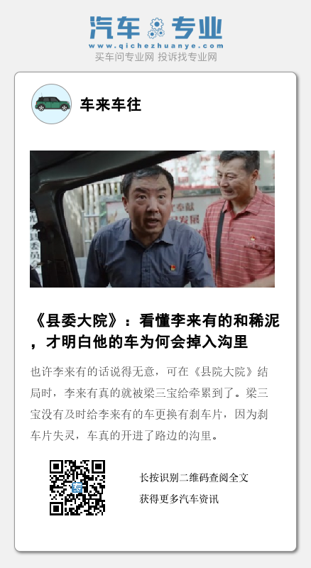 也许李来有的话说得无意,可在《县院大院》结局时,李来有真的就被梁三宝给牵累到了。梁三宝没有及时给李来有的车更换有刹车片,因为刹车片失灵,车真的开进了路边的沟里。
