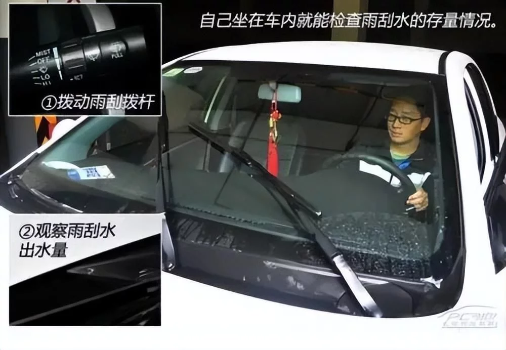 雨刮水存量也是可以自己检查的:拨动雨刮拨杆,看看喷出来的雨刮水量是否正常。