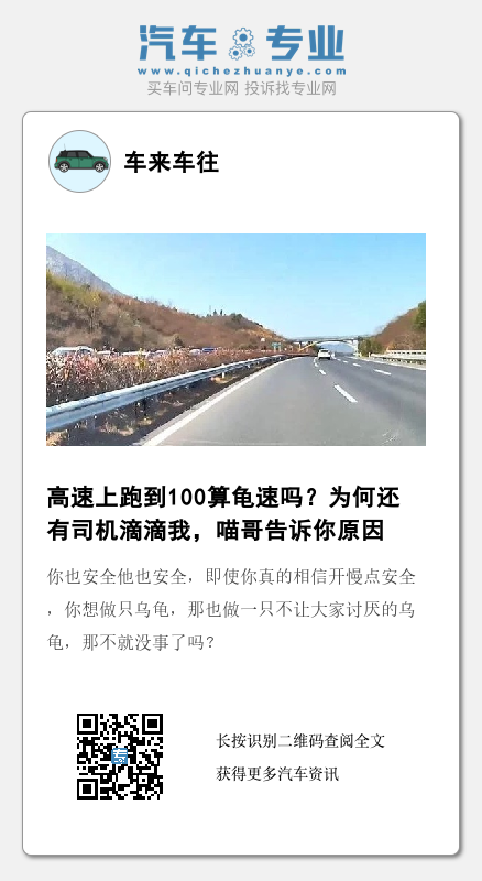 高速上跑到100到底算不算龟速?有朋友让喵哥给他评评理,因为他在高速上跑到100,还是会有很多车不停地滴滴他,所以他在想,是不是他就是我们眼中,所说的龟速和乌龟。