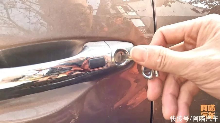 然后拿着这个钥匙,过来找到门把手,有些车子,这个地方,现在这个锁孔是堵住的。