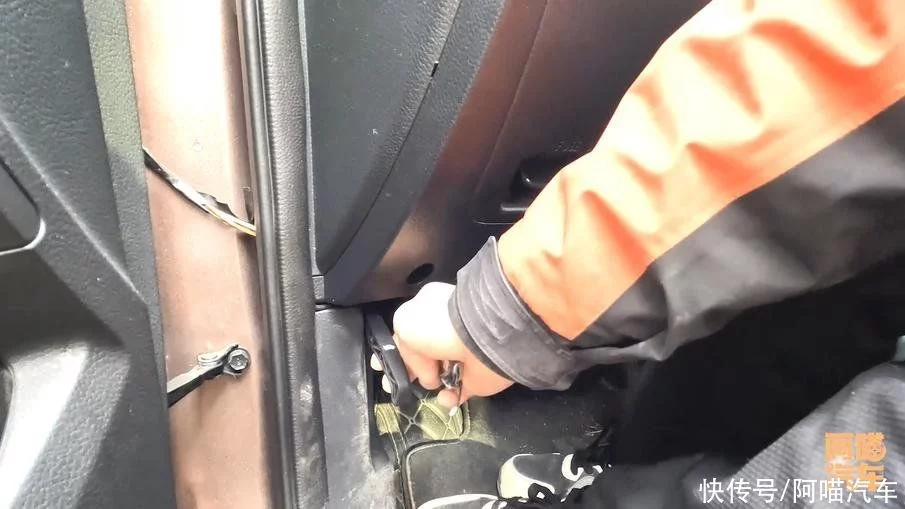 从这个地方塞进去,塞进去之后,把这个门顶开,你会听到那个气囊,一按一按,然后这个门就开始翘起来了。
