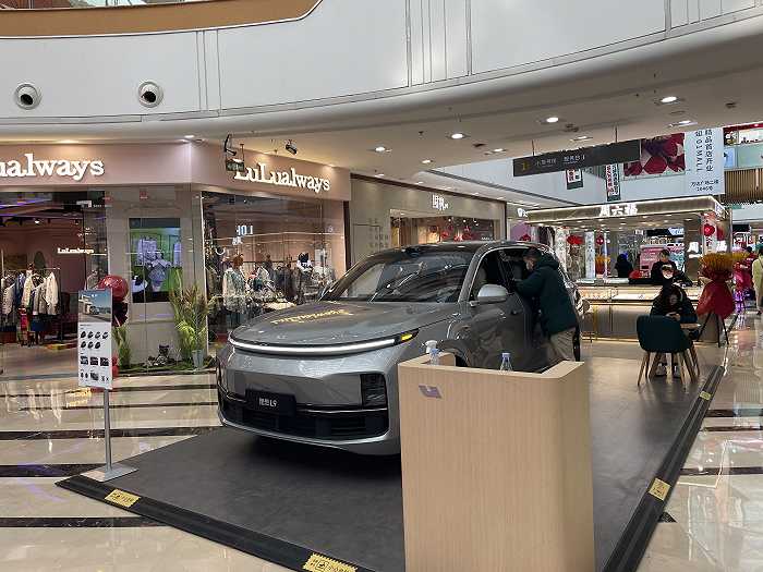 在万州较为热闹的万达广场,这里的一楼就汇集了多家销售新能源汽车的品牌,如合创、吉利、理想,其中理想为一个临时展台,展出的L9不时有消费者上前问询、体验。