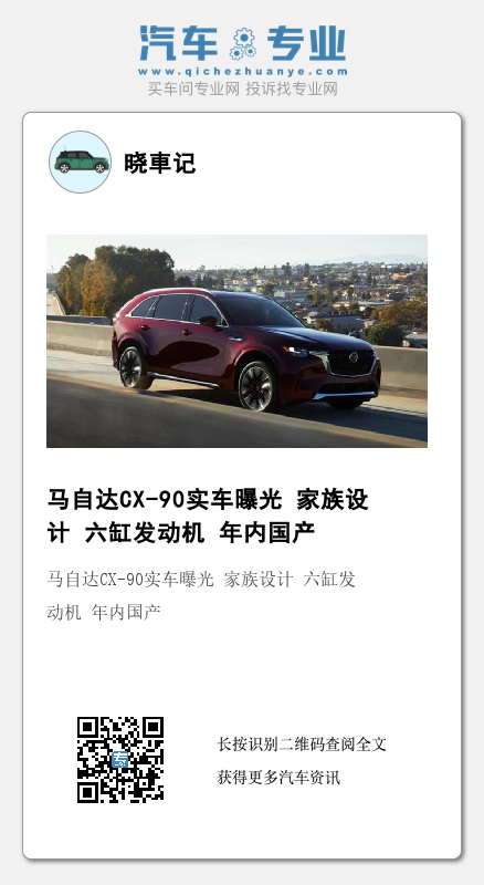 近期获悉马自达旗舰SUV车型CX-90美国时间1月31日上午发布,从最新曝光的图片来看,该车延续了马自达家族化设计,整体造型简洁流畅。