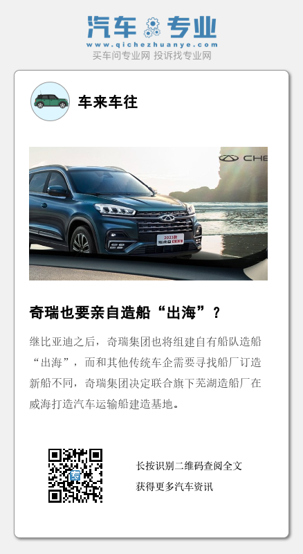 1月31日,盖世汽车获悉,继比亚迪之后,奇瑞集团也将组建自有船队造船“出海”,而和其他传统车企需要寻找船厂订造新船不同,奇瑞集团决定联合旗下芜湖造船厂在威海打造汽车运输船建造基地。