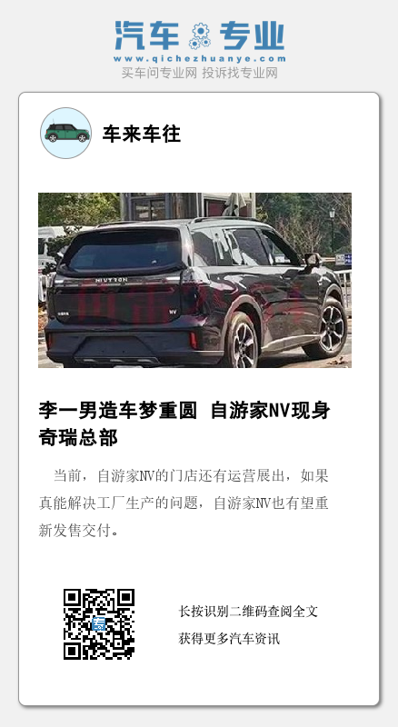 不过,李一男并非直接放弃了自游家汽车,有报道称,他仍保留了研发、品牌等核心部门,以维持公司运营,“研发还在进行”。而今,李一男的自游家NV汽车,又被曝出了新转机。