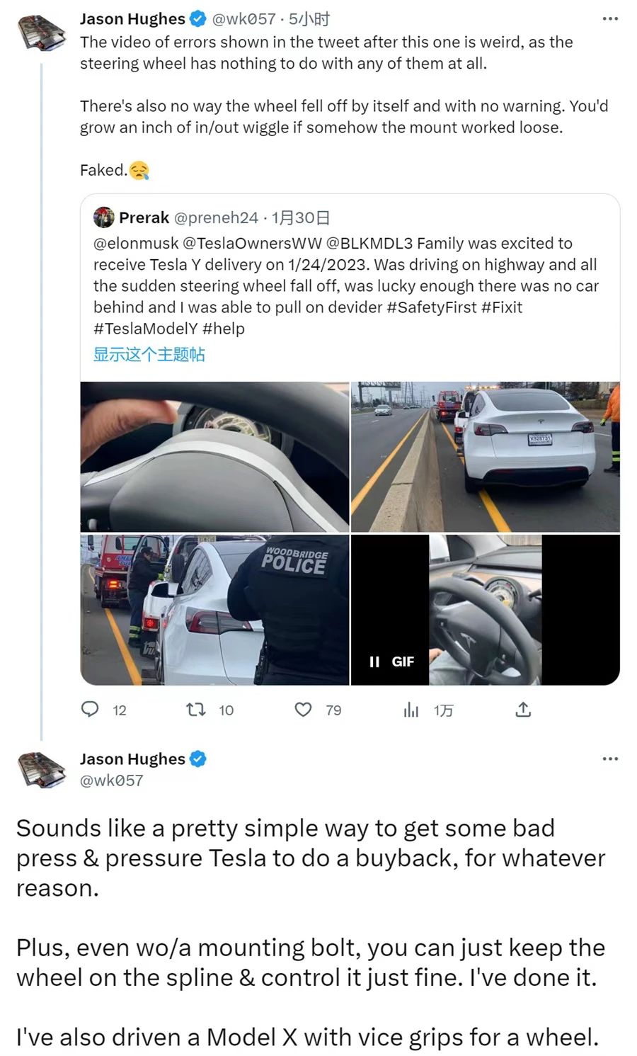 日前,使用推特ID“Prerak”的特斯拉车主表示,刚刚收到Model Y新车的交付,家人都怀着喜悦的心情回家的路上,高速公路上突然发生了方向盘掉落的危险万分的事态。没有想到,刚买的新车就出现了这样严重的问题。更令车主生气的是,这辆车刚提车1周,同时特斯拉服务中心还收了他100多美元修车费。