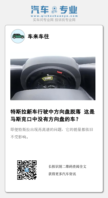 虽所幸车主最终安全停车,但这样离谱的“故事”还是有些出人意料。值得一提的是,这样的事故并不是第一次发生,2020年4月,推特用户“Jason Tuatara”就曾留言称:“Model 3使用一个多月后,方向盘就掉了。我担心车辆的其余部分是否也会脱落”。