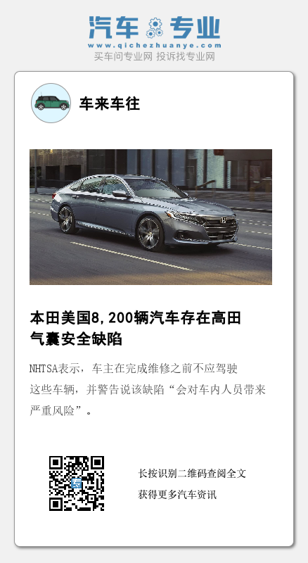 据外媒报道,本田在2月3日宣布,该公司在美国对8,200辆搭载了未修复的高田气囊充气装置的讴歌和本田品牌车辆发出了“请勿驾驶”警告。