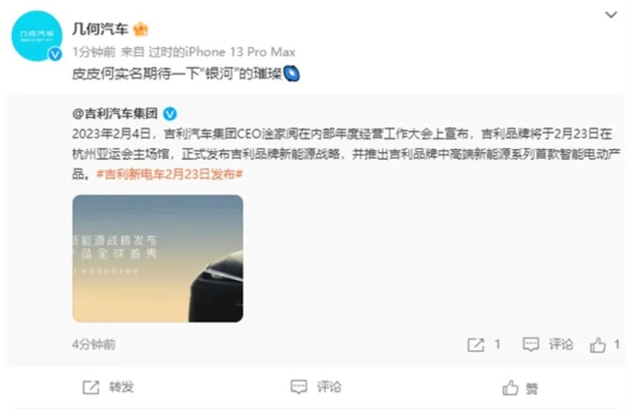 此前,吉利汽车集团官方微博公布了一组信息,2月23日,吉利将在杭州亚运会主场馆正式发布“吉利品牌新能源战略”,并推出吉利中高端新能源系列车型。有消息称,新品牌或命名为“银河”,而几何汽车官方微博在转发消息时,似乎透露出该品牌将命名:“银河”。