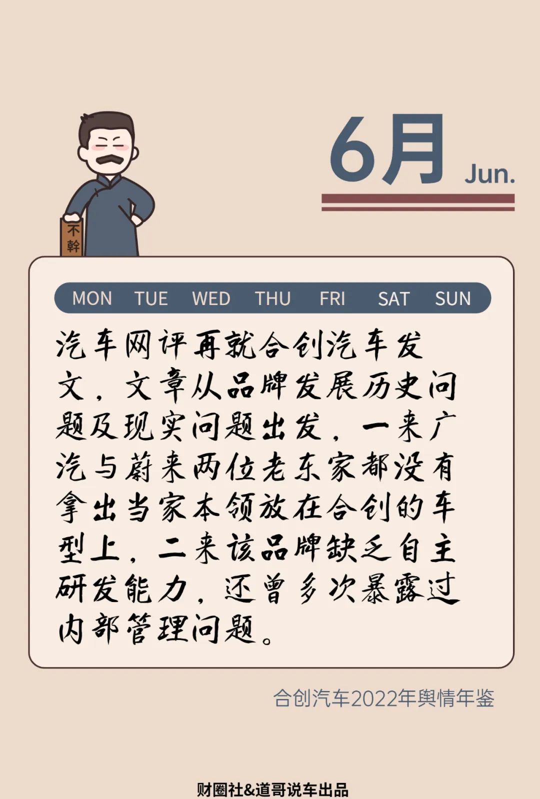 6月,汽车网评再就合创汽车发文,文章从品牌发展历史问题及现实问题出发,一来广汽与蔚来两位老东家都没有拿出当家本领放在合创的车型上,二来该品牌缺乏自主研发能力,还曾多次暴露过内部管理问题,比如曾经闹得沸沸扬扬的“员工被迫离职”事件。