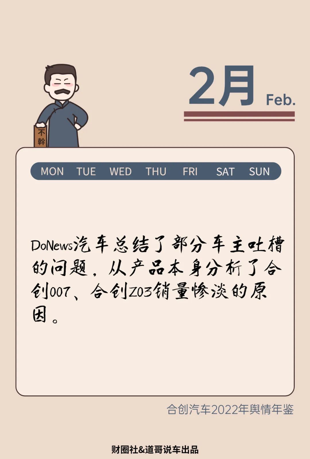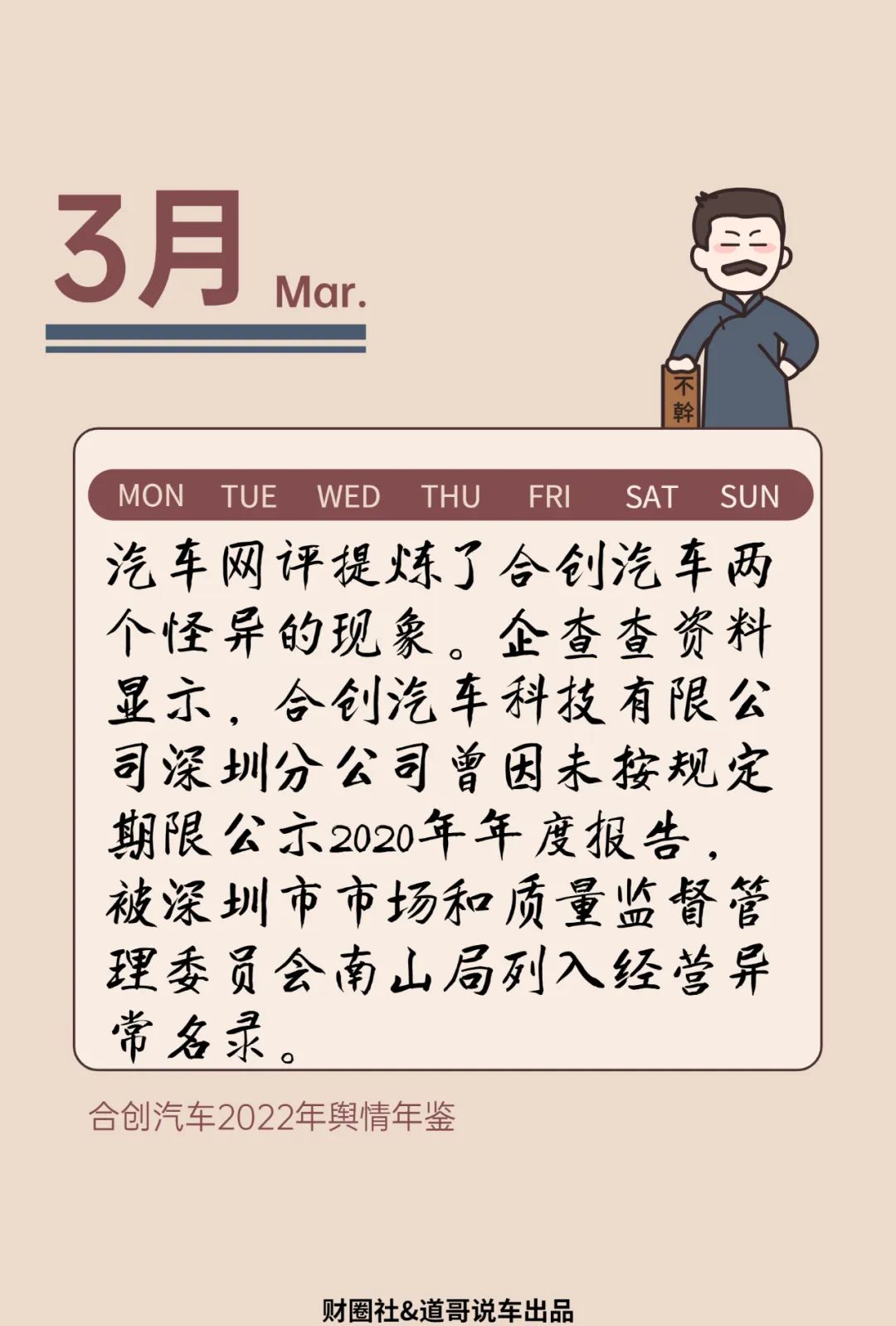 一季度,舆情均为对该品牌现状的担忧。DoNews汽车总结了部分车主吐槽的问题,从产品本身分析了合创007、合创Z03销量惨淡的原因;汽车网评提炼了合创汽车两个怪异的现象,一是合创汽车不随大流涨价,反倒以此为宣传点与竞品对比,二是销量如此低的品牌,居然在论坛上有着很高的活跃度,而这些均与高层认为的合创的短板在于品牌密不可分。3月,企查查资料显示,合创汽车科技有限公司深圳分公司曾因未按规定期限公示2020年年度报告,被深圳市市场和质量监督管理委员会南山局列入经营异常名录。