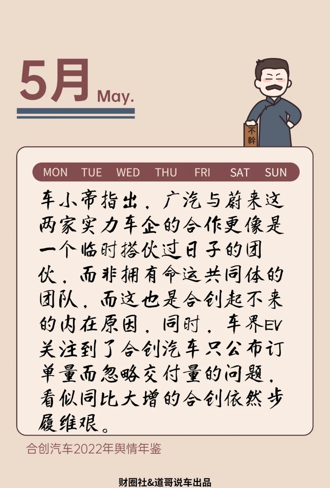 进入二季度,4月,汽车网评从广汽和蔚来这两个老东家的角度,指出合创生不逢时,是两大车企博弈下的“牺牲品”;5月,车小帝指出,广汽与蔚来这两家实力车企的合作更像是一个临时搭伙过日子的团伙,而非拥有命运共同体的团队,而这也是合创起不来的内在原因,同时,车界EV关注到了合创汽车只公布订单量而忽略交付量的问题,看似同比大增的合创依然步履维艰。
