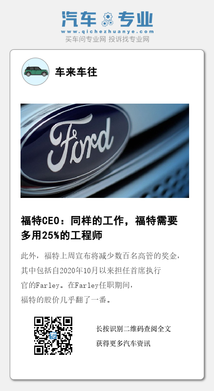 Farley在SiriusXM广播节目《杰森·斯坦的汽车与文化》(Cars & Culture with Jason Stein)上表示:“同样的工作,我们需要比竞争对手多出25%的工程师。我不能让效率降低25%。”