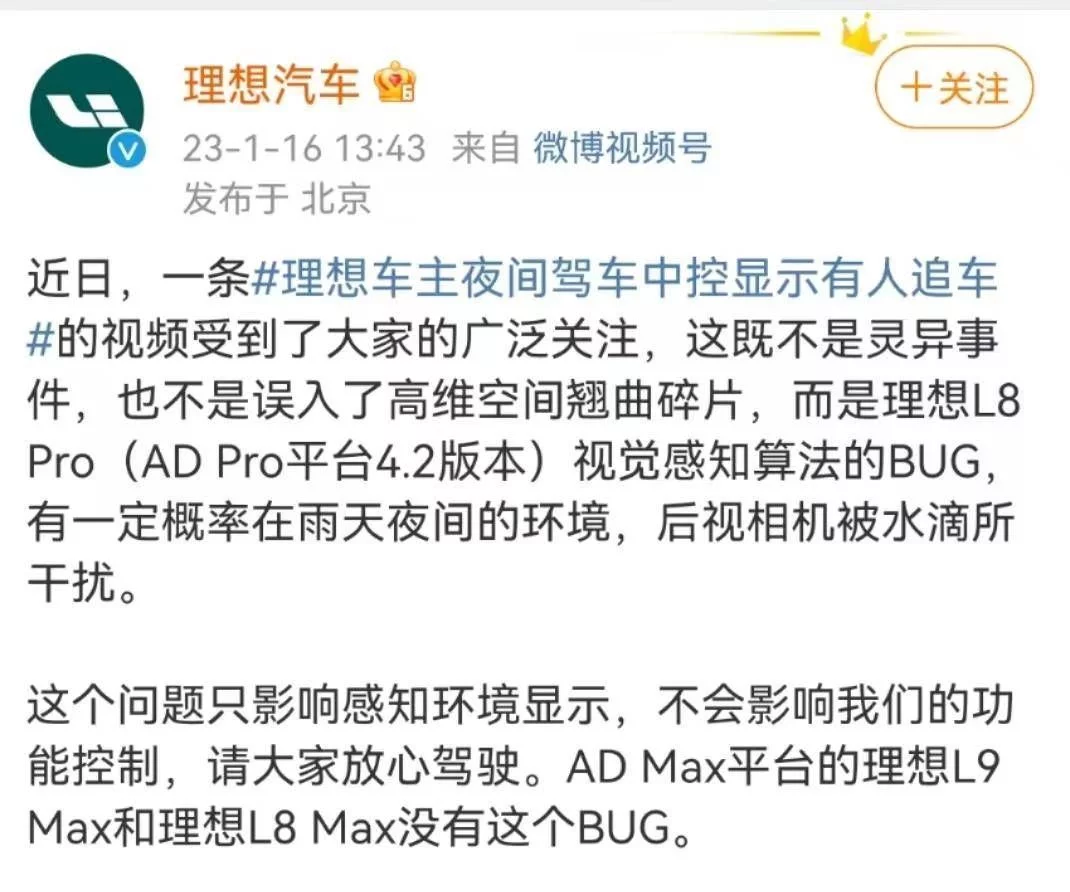 “既不是灵异事件,也不是误入了高维空间翘曲碎片,而是理想L8 Pro(AD Pro平台4.2版本)视觉感知算法的BUG,有一定概率在雨天夜间的环境,后视相机被水滴所干扰。该问题只影响感知环境显示,不会影响功能控制。”1月16日,理想官方回应了关于车主夜驾时中控显示有人追车的问题。