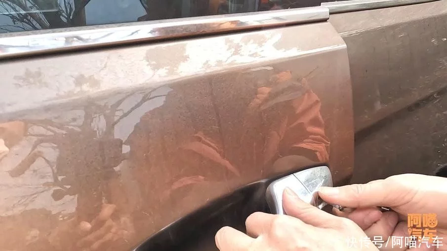 然后拿着这个钥匙,过来找到门把手,有些车子,这个地方,现在这个锁孔是堵住的。