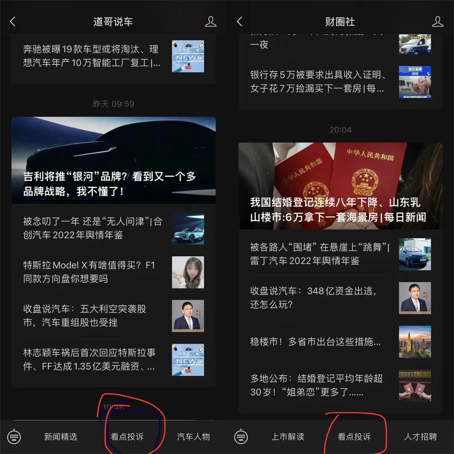 或者关注《道哥说车》、《财圈社》公众号,点击下方导航条“看点投诉”,进行投诉。