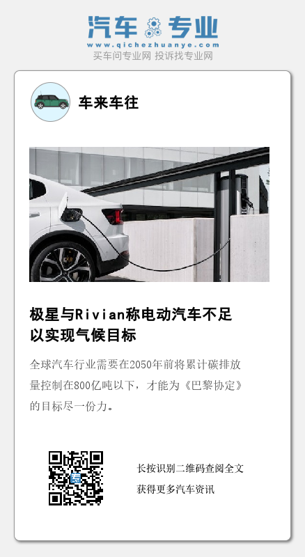 所以,这份报告得出结论:仅仅依靠电动汽车无法实现《巴黎协议》的目标。即使是完全由可再生资源提供动力的纯电动汽车,也不能使汽车工业的碳排放量控制在气候目标之下。极星和Rivian认为,发展电动汽车不足以让汽车行业尽到《巴黎协议》规定的减排责任。