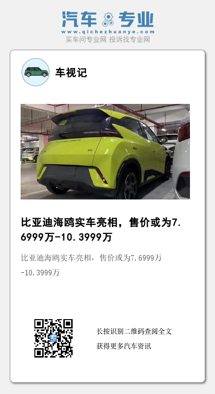 作为比亚迪旗下A0级代步车比亚迪海鸥(图片)一直以来受到了很大的关注,早在今年年初新车已正式在工信部申报,近日,小编再次获悉了一组新车的实车图片,并爆出预售价格,新车或7.6999万起售,并提供多个版本,最高售价达10.3999万,据相关消息透露,新车将最快于今年3月份上市。