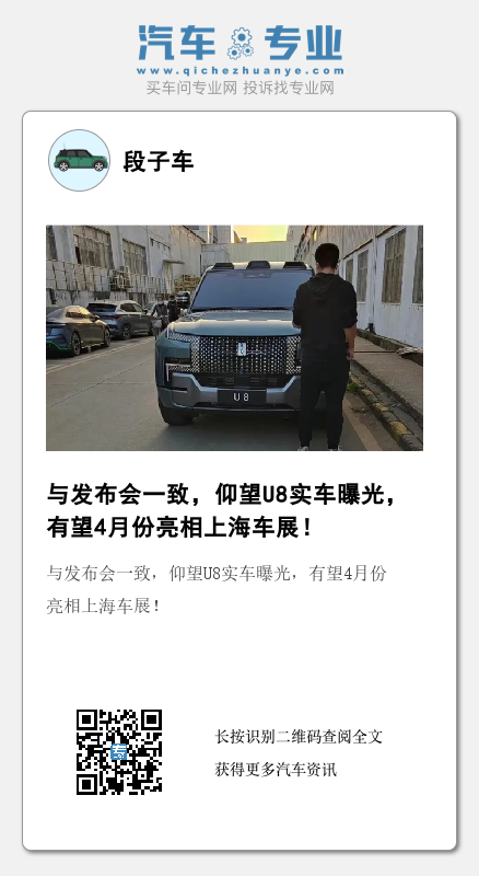 仰望U8(图片)的发布,凭借着黑科技显然已经成为了今年年度最重磅车型之一。近日,关于新车的无伪装路试谍照也终于浮出水面,按照这个进展速度,新车有望4月份亮相上海车展,三季度正式上市。
