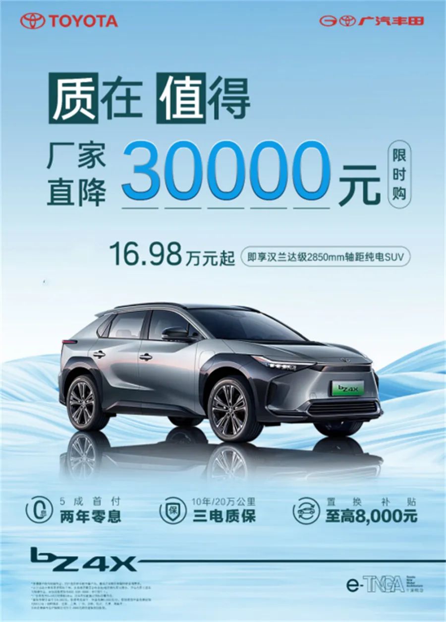【文/道哥说车 听风吟】2月9日,广汽丰田一条推文让《道哥说车》编辑惊掉了下巴,“广汽丰田bZ4X厂家直降3万元”。降价后,广汽丰田bZ4X的起售价来到了16.98万元。