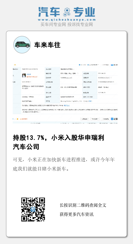 2月9日消息,上海华申瑞利汽车科技有限公司发生工商变更,注册资本由100万人民币增至120万人民币,同时,股东新增小米关联企业瀚星创业投资有限公司、天津海河顺科股权投资合伙企业(有限合伙)等。