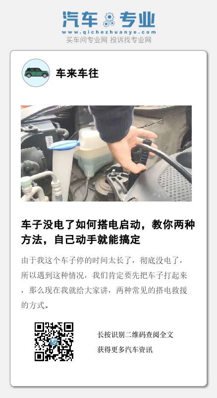 由于我这个车子停的时间太长了,彻底没电了,所以遇到这种情况,我们肯定要先把车子打起来,那么现在我就给大家讲,两种常见的搭电救援的方式。