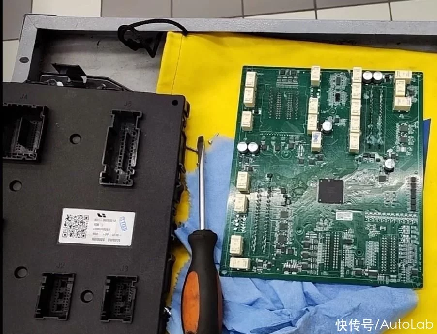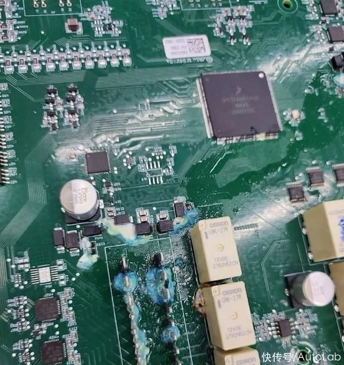 现场拆解开后,确实在这块硕大的集成电路板上看到了水的痕迹,证实车主并未说谎。然而小孩的一泡尿就能导致车辆的直接故障,并且无法继续行驶,是不是太嫩了?