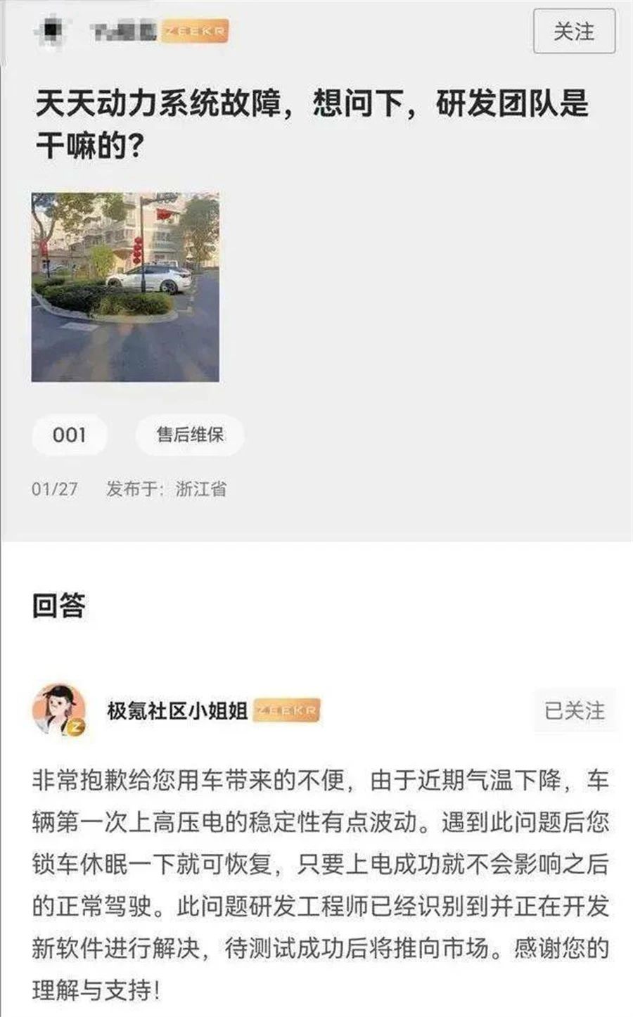 一位来自北京的王先生称自己的极氪001已经是第三次出现动力系统故障了,他认为,频繁故障无法行车存在严重安全隐患,“开着车,突然就无法行车,你无法预测下一次在什么场景下出现,这太危险了,很容易出车祸。”