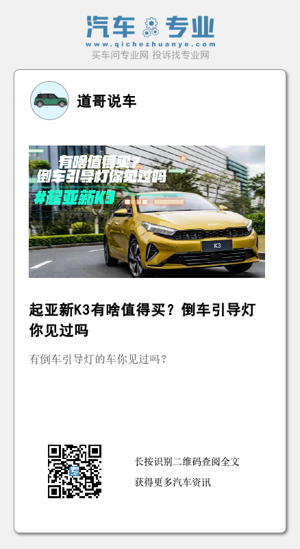 有倒车引导灯的车你见过吗?今天我们就聊聊全新起亚新K3。相较老K3,在内外饰设计、智能互联科技、主动安全驾驶辅助系统等方面全面优化升级,售价区间为11.29-14.39万元,在紧凑型轿车区间内可以说是高性价比的新卷王。全新起亚K3还有一项独创功能,倒车引导灯,倒车时LED导向照明投射到后方路面,对周边车辆及步行者安全传达倒车意图,预防倒车事故。怎么样够厉害吧!