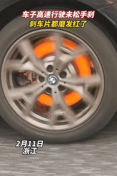 网友上传视频显示,2月11日,浙江,一辆未上牌的宝马i3电动车在道路上高速行驶,但是该车疑似没松手刹,四个车轮的刹车盘也已全部被磨红,还不时有火星飞溅。