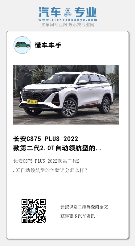 大家好,这次体验的这一台车是长安汽车旗下紧凑型SUV——长安CS75 PLUS(图片|配置|询价) 2022款第二代2.0T自动领航型(官方指导价14.79万),这款车型是在2022年2月份上市的。下面我将会对这一台车多维度进行解析,每个方面在同级别车型中的表现进行评分,若满分是100分。
