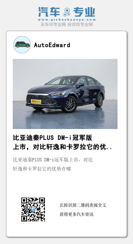 写在最后:比亚迪秦PLUS DM-i2023款冠军版对比卡罗拉和轩逸,最大的优势在于超低的油耗、不错的外观和内饰设计以及较高的性价比。比亚迪DM-i超级混动系统已经得到消费者和市场的认可,再加上指导价下探到10万以内,油电同价的时代已经到来。至于它能否撼动轩逸和卡罗拉在A级车市场的地位,只能说很有可能,具体结果如何,让我们拭目以待吧。