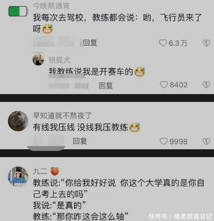 也有的学生操之过急,车速太快,教练直接讽刺到,哟飞行员来了呀。这天赋的确不是开普通车的人,估计要去开开赛车才能找到感觉呢。