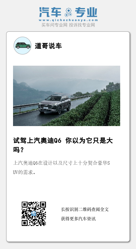 总的来看,上汽奥迪Q6在设计以及尺寸上都切中了中国市场的喜好,精致细腻的整体制造工艺,加之足够丰富的科技与豪华配置,静谧舒适的行驶质感也十分契合豪华SUV的需求。甚至,如果综合考虑价格以及产品力的话,这款车可能是同价位区间内,最实惠的豪华SUV。