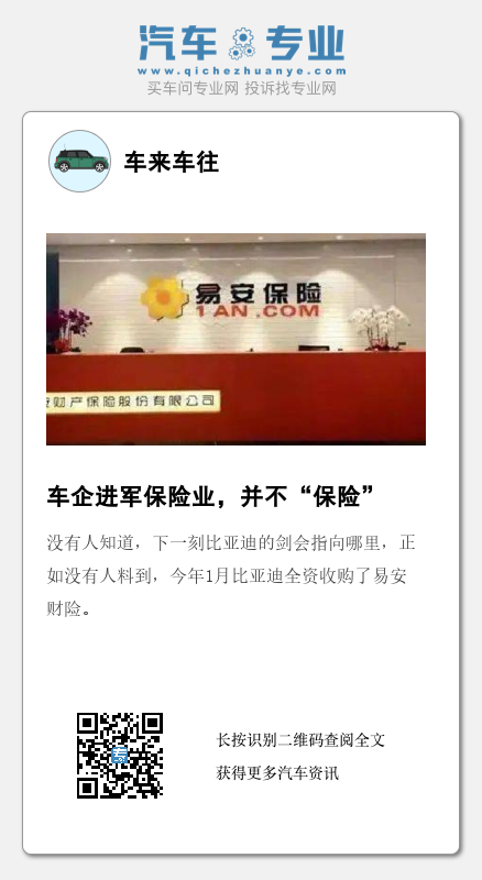 因此,有行业人士预测,比亚迪的下一步动作是向银保监会申请车险经营资格,而且很可能重点围绕新能源汽车开展保险业务。